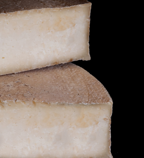 Formmatge semi curat de pasta premsada i escorça natural amb una textura elàstica amb petits orificis mecànics.